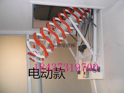 相对于手动款,电动款大大方便了您的使用,不用费力,一个遥控器就可以控制楼梯收放,我们的电动款还配有电机电动推杆,停电时也可以使用哦亲。