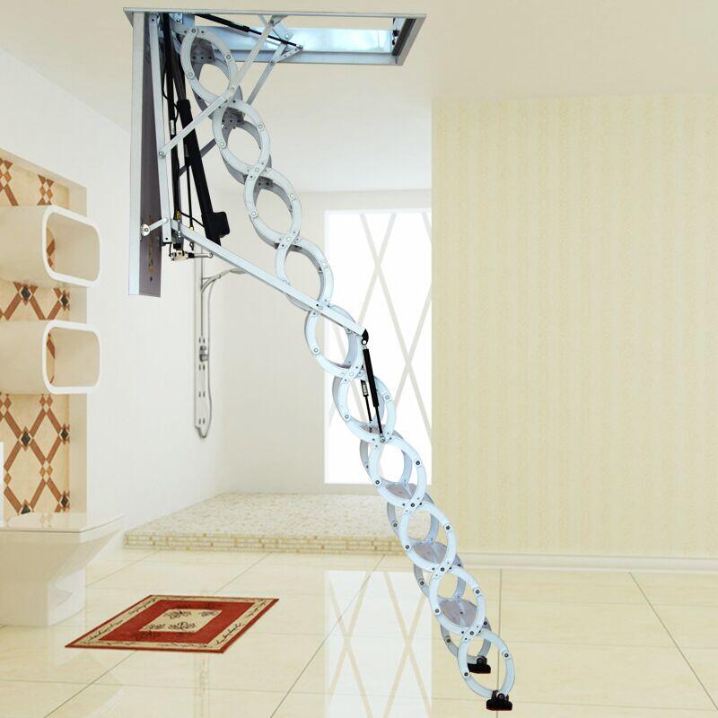 伸缩楼梯主要是由冷轧钢板制成(也有钛镁合金材质),上方有一个木框和一个木板,木框主要是规定楼梯开洞洞口的大小,伸缩楼梯需要在规定楼梯开洞的位置预留洞口,大小可以根据自己需要来开洞口,也可以根据我们梯子尺寸来预留。木板主要的作用在于不用时可以盖上这个洞,节省空间,美观方便。简洁明亮,收放自如,是小阁楼用之极品。它的设计是根据人体力学与美学来制作的,不管是使用还是外观,都会让您舒适。