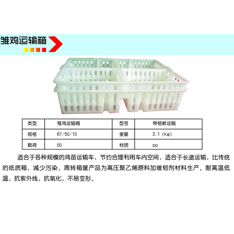 适用于各种规模的鸡苗运输车,能有效地节约并合理利用车内空间,适合于长途运输,比传统的纸质箱更为环保。