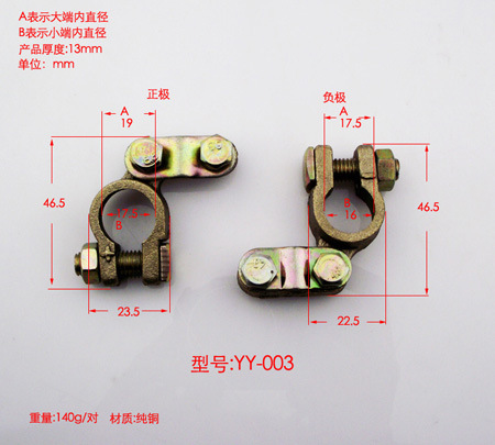 专业生产各种电瓶夹保护套,汽车电瓶夹,电瓶夹,铜质电瓶夹,合金电瓶夹,铅制电瓶夹等优质电瓶夹及电瓶夹护套,质量好、价格实惠,深受国内外客户的认可和亲睐。欢迎广大客户咨询。