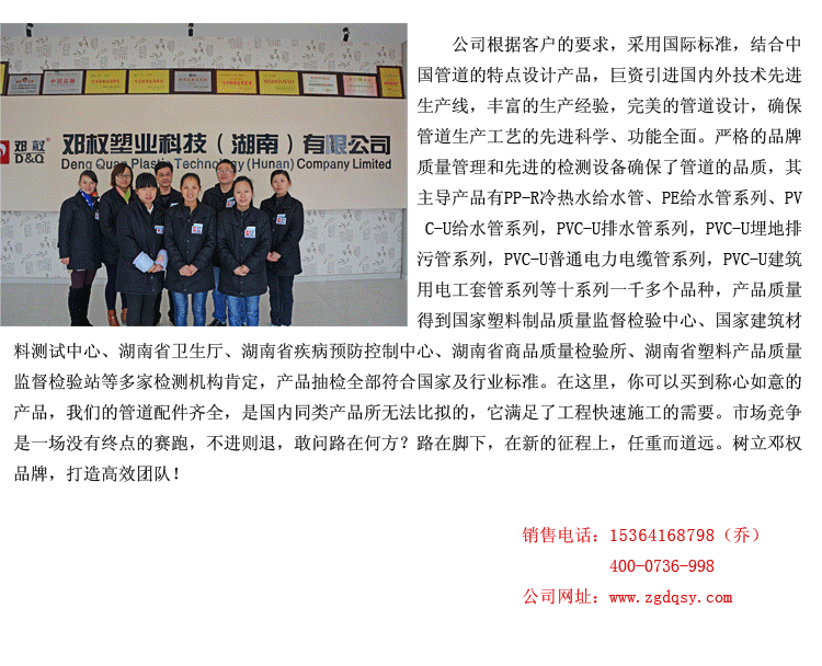邓权塑业科技(湖南)有限公司长期生产经营PVC系列管材管件、PPR系列管材管件、PE系列管材管件、HDPE硅芯管等系列管材管件、水暖五金卫浴系列,产品多样,规格齐全。厂家直销,质量保证,欢迎咨询洽谈。