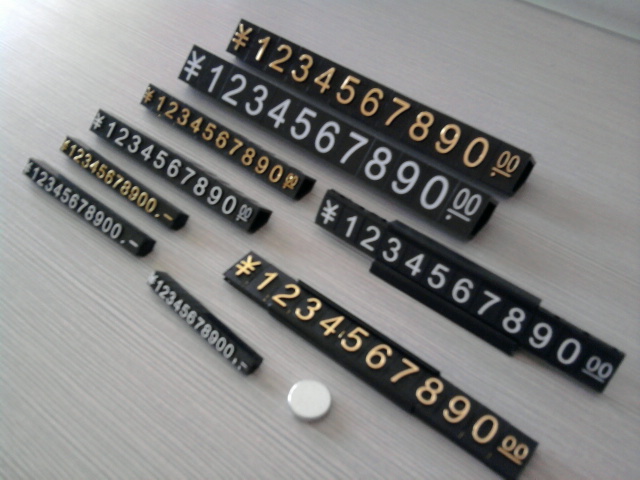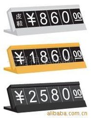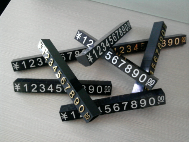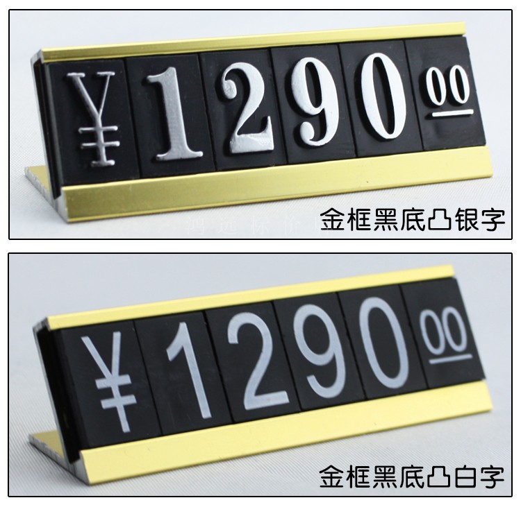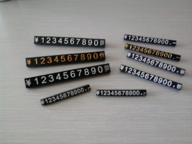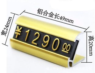 价格牌采用铝合金框,ABS塑料经模型精制而成,产品由0--9等12位数字一条、一个铝合金框架组成,框架规格为4.9*1.7cm,框架备有金色、黑色供买家选择,产品美观大方、显眼高贵、典雅亮丽、经久耐用、数字组合自由等特点;