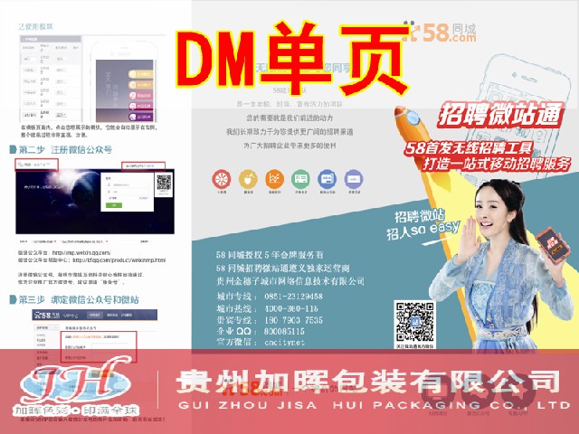 贵阳哪里买厂家直销DM宣传单页 _一级的DM设计   贵州加晖包装印刷(联系电话18302600113)主要是一家为各大中小企业提供DM宣传单页的企业公司。本公司自2013-09-11成立创办就一直致力于为DM宣传单页的生产制造,我们秉承“诚信经营、环保制造、安全包装”的经营理念,为公司的未来而努力奋斗。我们的产品被广泛销售到贵州贵阳,深受各大中小企业的喜爱和赞赏。我们欢迎有需求的客户来电咨询了解,联系人:项富良    凭借着娴熟的产品生产工艺,贵州加晖包装印刷主要负责2400*160*1200规格的DM宣传单页生产,并服务于贵州贵阳,在公司领导人与51人左右的员工共同的努力下,公司年营业额达每年500万元左右。    本厂专业生产规格为2400*160*1200的DM宣传单页等主营产品,提供的DM宣传单页颜色、印刷LOCO可根据用户需求定制。本厂以高质量的品质和一流的销售服务迎得了广大客户的良好商业信誉和企业形象。产品畅销贵州贵阳各地,受到了广大各大中小企业的认可与赞许。    以上的,一流的DM设计,DM单页印刷价格,宣传单页印务不知道有用吗?请继续往下阅读    DM宣传单页主要的材质是卡纸;铜板纸,如果客户购买了贵州加晖包装印刷的产品,可以通过现金交易;支付宝;银行转帐或在线支付的方式付款,付款后我们会在付款当天内发货。如果对我们的产品有什么疑问,可以来电咨询。联系电话:0851-84813170。    上乘DM单页印刷,DM单页印刷价位 以下是详细信息    DM宣传单页品牌:加晖    生产厂家:贵州加晖包装有限公司    生产地址:贵阳国家高新区    用途:产品展示介绍    是否定制:可定制    是否加印LOGO:加印LOGO    运费:卖家承担    产品等级:高级;A级/品;1级/品    价格:商议    我们贵州加晖包装印刷愿和各界广大各大中小企业一起发展壮大、共同成长。我们的出发点就是力争成为一个真正价值公道、高品质、服务周到、高效率的包装印刷纸业销售和采购企业。    如果您对我们的一流的DM宣传单页,专业的DM宣传单页,便捷的DM设计www.gzjhbz.com.cn感兴趣,请随时登陆贵州加晖包装有限公司网站详细了解