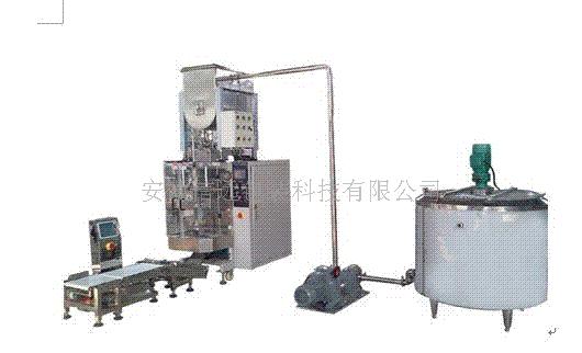 待包装物料注入冷热缸(含自动搅拌装置可加热保温)----------?转子泵自动泵送物料至高位搅拌缸(受搅拌缸料位控制)--------?XY-YG液体灌装机按设定重量自动计量充填---------?XY系列自动包装机自动制袋成型 (可选配冲孔、插角、排气等附件装置)--------? 包装机完成自动封切--------?CJB2000重量选别机自动检测重量(选配设备)--------?合格重量成品包装经成品输送机输送至人工装箱工位