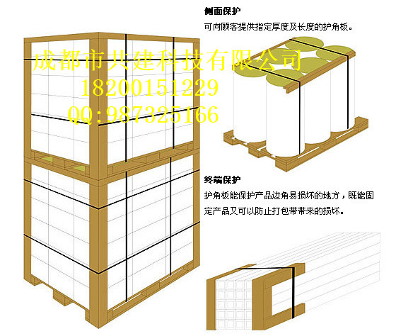 组成一个包装整体:它和打包带一起使用,在呈单体形式的纸箱、板材、金属管等物品的每个角上放一个纸护角,并用打包带打紧,就可以形成一个坚固而稳定的包装整体。