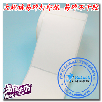 易碎纸(易碎条码纸)是以易碎印刷材料(PE与木桨或PET与木桨合成)为面材,面材多做成白色,便于后续印刷打印。在背面涂有强力胶黏剂,其面材断裂强度低于胶黏剂粘合强度,科浪印刷当易碎标签材料贴在承贴后再揭起来,材料会无规则断裂,显示产品包装己开启,或防窜货识别条码被破坏,且无法复原!科浪印刷难碎型易碎不干胶标签使用前具备足够韧性,无论是打印标签或是取下标签、粘贴标签都不会对标签造成损坏.只要标签粘贴在附着物体上,就会发挥其功效,粘贴后1小时一个状态,3小时一个状态,随着时间推移,易碎标签会牢牢附着在承载物上,一撕即破.与市面上常见的保修易碎标贴相比,科浪印刷公司易碎标签提高了标签粘性,很好地解决了在使用过程还没粘贴在承载物上就己经出现破损或粘贴后容易非人为破裂问题.另外科浪条码公司根据不同的使用环境,提供特碎型、中碎型、难碎型易碎标签供客户参考选择。