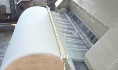 将加工的纤维清理干净,去除其中的金属、硬杂等物,均匀地(不可过厚)铺在自动进料帘上,可实现自动进料;帘子将纤维送到罗拉口,由罗拉将纤维挤紧送到刺辊前,纤维即被刺辊钩拉着松开。其中杂质受刺辊离心力的作用,将沿刺辊的切线方向抛出。纤维通过锡林、工作辊、转移辊多次反复转移、梳理、混合均匀,再由道夫经剥棉机构剥离后输出一层一像纸一样薄的纤维;用细竹杆理上卷棉筒即可实现自动卷棉。成形棉卷在运转的卷棉筒上用双手一拉(或竹杆一卷剥或用剪刀剪断)即可随卷棉筒输出(160型机无需抖动,出棉宽度可控制),输出的棉卷放在铺棉板上轻轻的抖一抖,就能达到我们需要的长度和宽度。
