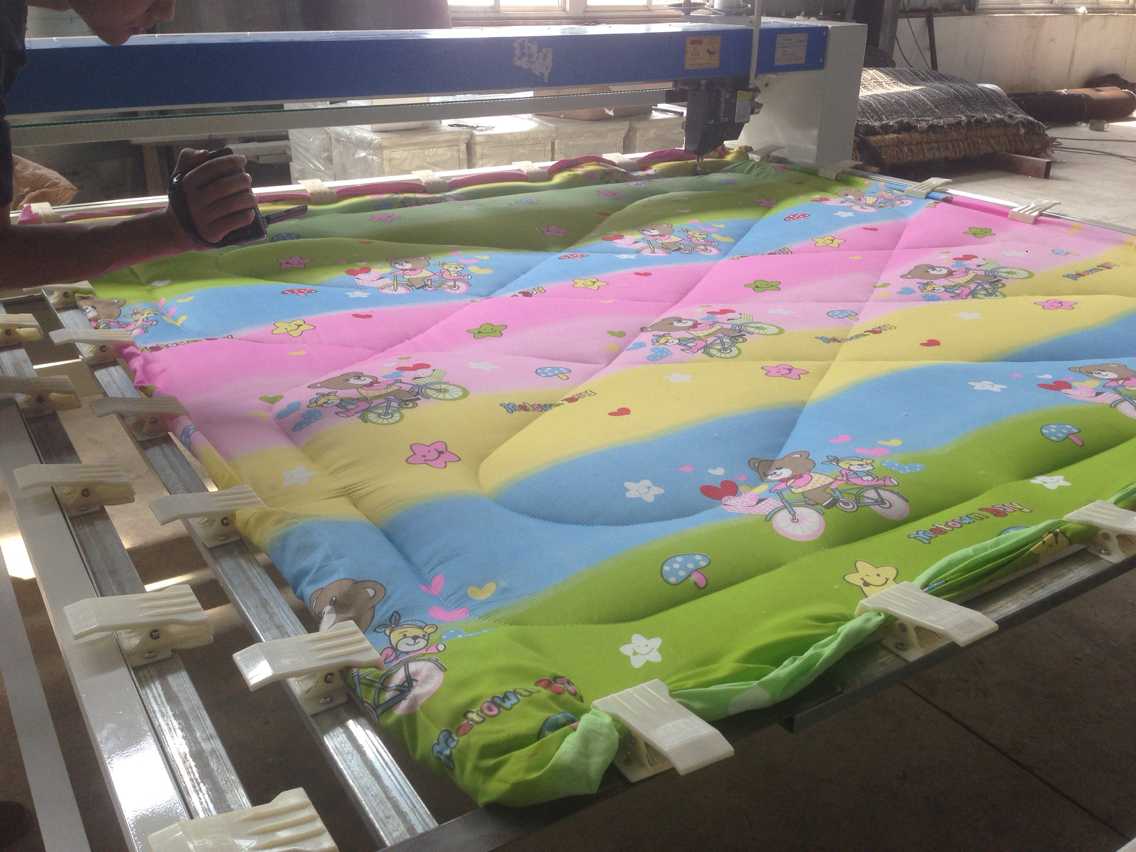 电机型号:二相1.5千瓦 合用范围:个体加工网套及专业加工被套等,电动绗被机结构紧促,调整简朴,它合用于加工棉被,棉门帘,花丝绵被等,具有线迹美观,线链牢固,富有弹性。是棉被加工理想机具。
