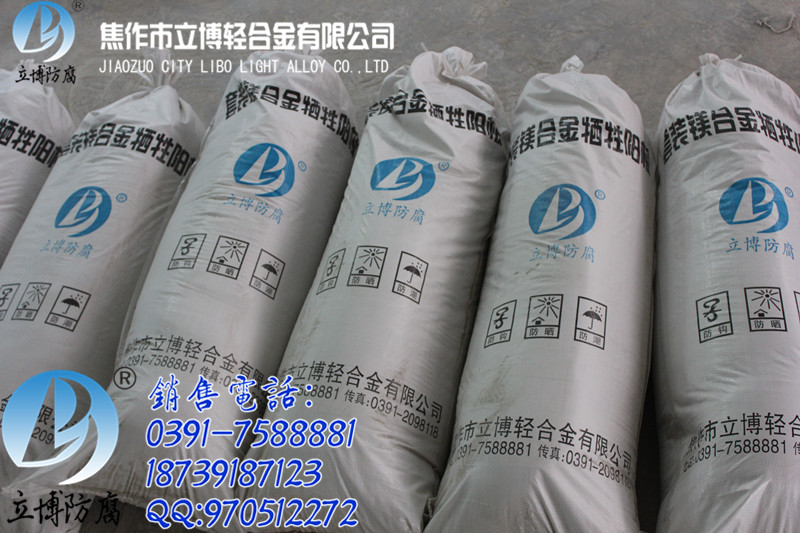 我公司生产的镁合金采用优质的原材料来生产,阳极电位负,单位质量发生电量大,是理想的牺牲阳极材料。适用于土壤、淡水及海水等介质中的金属构筑物的阴极保护,例如石油燃气管道,储罐,热水交换器,冷凝器等等。
