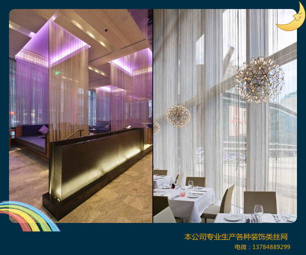 室内装饰用金属丝网,金属装饰丝网(金属编织网)是由金属棒材及金属缆线或者金属线材编织而成,表面具有织物纹样的装饰效果。由于有多种编织方法,孔眼的风格也呈现不同效果,可根据客户要求用不用的金属材质制作,常用的金属材料分为铝合金、铜、不锈钢等。百度一下,金属装饰丝网。