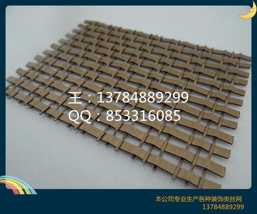 仿古铜色金属丝网,隔断吊顶装饰具有不燃性,高强度,坚固,功能性强,易于维护,易于成型,超常的使用寿命,并能很好的对建筑结构物起保护作用等特点,而且更符合环保及消防安全的要求。其安装简便、快捷,可大面积运用,也可只作局部装饰点缀。金属装饰网不锈钢装饰网的外形别致、典雅,装饰效果生动、强烈、多样,不同光线、不同环境、不同时间段、不同观察角度,其效果都不尽相同;可应用于多种场合与用途,不锈钢特有的质感和灯光的配合效果,彰显典雅气质,非凡个性、高贵品位。
