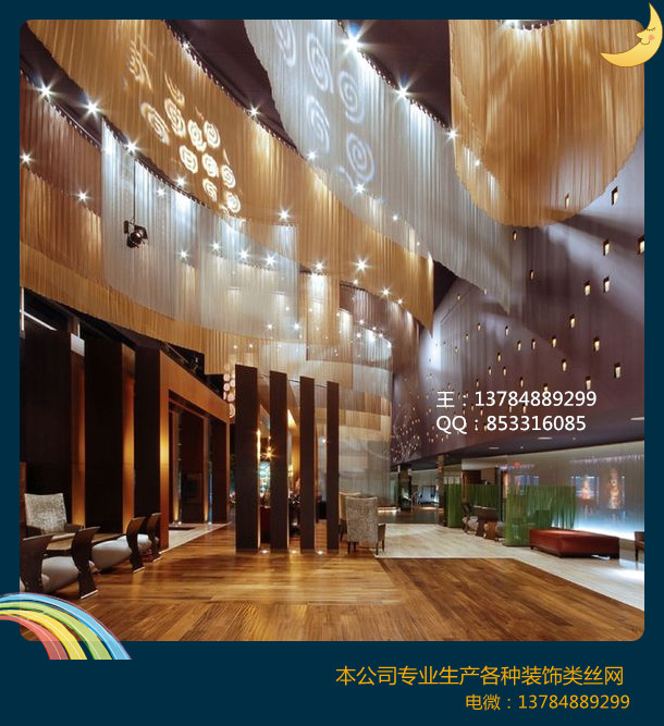2、天花吊顶:钛金色金属丝网,不锈钢镀钛工艺,永久不退色有平面式,弧形挂法式,特殊造型式:不锈钢装饰丝网视觉通透,开阔,节省空间,装配简单方便,它比其他材料具有更多的使用功能、更多的装饰效果,并更符合环保、消防安全的要求。