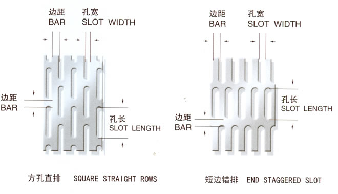 孔型:长孔、圆孔、方孔、三角孔、鱼磷孔、桥式孔、菱形孔、五角孔、六角孔、八字孔、十字孔、指甲孔、梅花孔、人字孔、工字孔及其它异型孔。