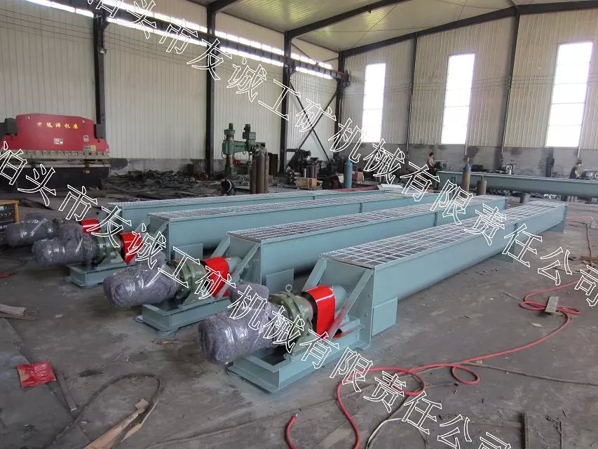 无轴螺旋输送机结构形式的设计保证所处理的物料流通,无堵塞;在工作过程中设有排水功能。无轴螺旋输送机主要由无轴螺旋、U型螺旋槽、盖板、衬板、进、出料口、排放口和驱动装置组成,物料由进料口输入,经无轴螺旋推动后,由出料口输出。驱动装置:驱动装置置于螺旋输送机一端,采用电机减速机和螺旋驱动轴直连形式,无需联轴器,拆卸、维修方便,驱动轴能承受弯距和轴向挤压力同时作用的负荷。驱动装置(电机和减速机)采用轴装式减速机的结构形式,它运转灵活、平稳可靠、无异常噪音,减速箱所有结合面及输入和输出轴密封处不会渗漏。驱动电机适用于380V、3相、50Hz,它的防护等级为IP55(户外型),绝缘等级为F级。