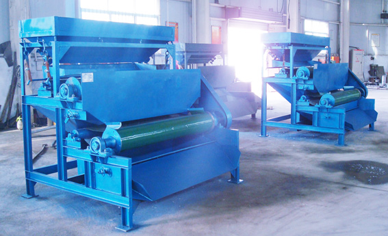 设备的工作原理:将0.5—5毫米的原矿送入上料斗,振动器进行布料,出料量通过调整机构进行精确调整。磁辊由专用电机拖动,转速通过控制器进行自动调整,以控制磁选机的产量和精矿品位。矿粒由输送带送入上磁辊进行分选,由于矿粒有磁性,立即被强磁场吸附在磁辊上,而杂石粒由于没有磁性,磁辊的磁场对它不产生吸引力,随着磁辊的转动,矿粒一直被吸在磁辊上,而杂石粒在磁辊转到前端位置时被抛出掉在隔矿板的前面,矿粒继续被磁辊带到脱磁区时自动掉入一选集矿斗收集为精矿成品。由于上磁辊掉下的杂石中还夹带有少量的矿粒,这些杂石进入下磁辊继续进行磁选,磁选后的成品矿粒进入二选集矿斗收集为成品,被抛出的杂石经尾矿口排出,至此磁选工序结束。由于原矿中的杂石被抛弃,所以使矿石的品位得以提高。选锰矿设备的用电量仅为4KW,磁选投入成本是相当低的。