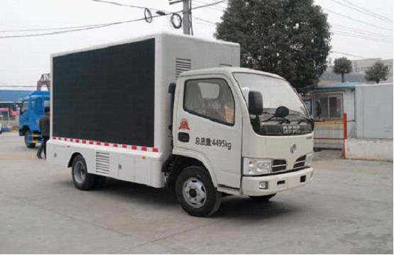 该车是用于广告宣传的专用车辆。该车两侧为LED屏,侧面选装滚轴装置,LED单色屏;后部选装LED屏及通风口。随底盘选装驾驶室。防护材料:Q235碳钢,该车侧后包围装置已经符合车辆侧后防护尺寸标准要求,侧包围距地350mm,后包围距地450mm。