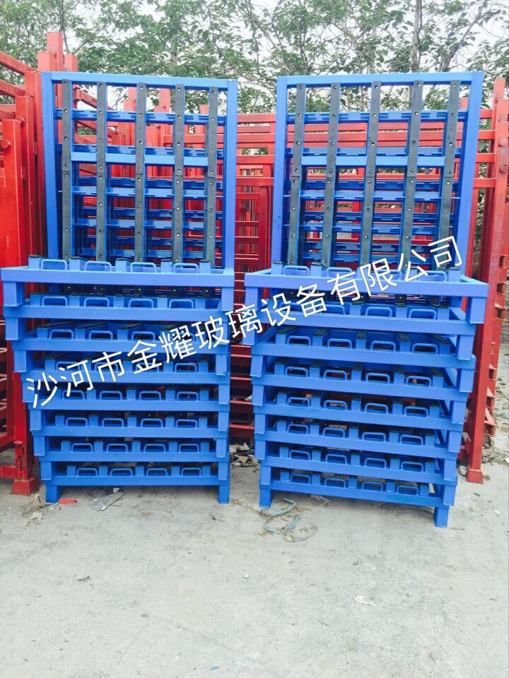 L架是集仓储、搬运于一体的多功能玻璃存放架,是存放零散裁片或中空成品玻璃等的优质选择。架子角度严格控制在90度,刚下线的中空玻璃绝不会产生滑片。该架子既可用地牛、叉车进行平稳移位,也可用行车直接装卸,闲置或回空运输时一摞可叠加10个,节省库存或运输空间,提高仓库利用率。 常用规格有: 1.长1800x高1600x宽750mm,玻璃有效存放厚度达540mm,小巧灵便,适合小货车架子背对背运输。 2.长1800x高1600x宽950mm,玻璃有效存放厚度达690mm,适合中型货车运输。 3 .长1800x高1600x宽1150mm,玻璃有效存放厚度达890mm,适合大型货车运输。 A字架分为仓储架和运输架两种。产品均选用国标材质,安全可靠。运输架每侧可存放4包大板玻璃(长和高可定做),满足玻璃长途运输要求。两种架子可根据玻璃规格、客户要求定做。 原片放置架。该架针对大型玻璃厂和工厂,对产品规格单一的玻璃,大规模储藏使用,每排可堆放几十包玻璃。我们可按机器规格型号或客户图纸要求加工。沙河市金耀玻璃设备有限公司 。纪杰,13191622082。