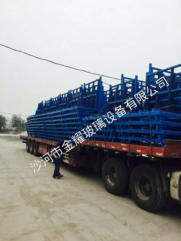 沙河金耀L架是集仓储、搬运于一体的多功能玻璃存放架,是存放零散裁片或中空成品玻璃等的优质选择。架子角度严格控制在90度,刚下线的中空玻璃绝不会产生滑片。该架子既可用地牛、叉车进行平稳移位,也可用行车直接装卸,闲置或回空运输时一摞可叠加10个,节省库存或运输空间,提高仓库利用率。 常用规格有: 1.长1800x高1600x宽750mm,玻璃有效存放厚度达540mm,小巧灵便,适合小货车架子背对背运输。 2.长1800x高1600x宽950mm,玻璃有效存放厚度达690mm,适合中型货车运输。 3 .长1800x高1600x宽1150mm,玻璃有效存放厚度达890mm,适合大型货车运输。 A字架分为仓储架和运输架两种。产品均选用国标材质,安全可靠。运输架每侧可存放4包大板玻璃(长和高可定做),满足玻璃长途运输要求。两种架子可根据玻璃规格、客户要求定做。 原片放置架。该架针对大型玻璃厂和工厂,对产品规格单一的玻璃,大规模储藏使用,每排可堆放几十包玻璃。我们可按机器规格型号或客户图纸要求加工。