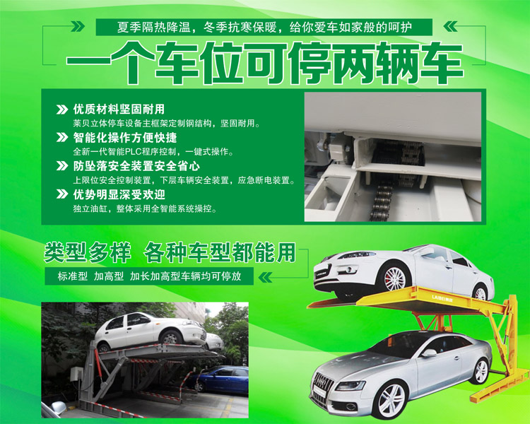 PTJ301-20家用俯仰停车设备共有上下两个空车位。下层车辆可以随意进出,若要停放上层车辆,首先要将下层车辆开出。