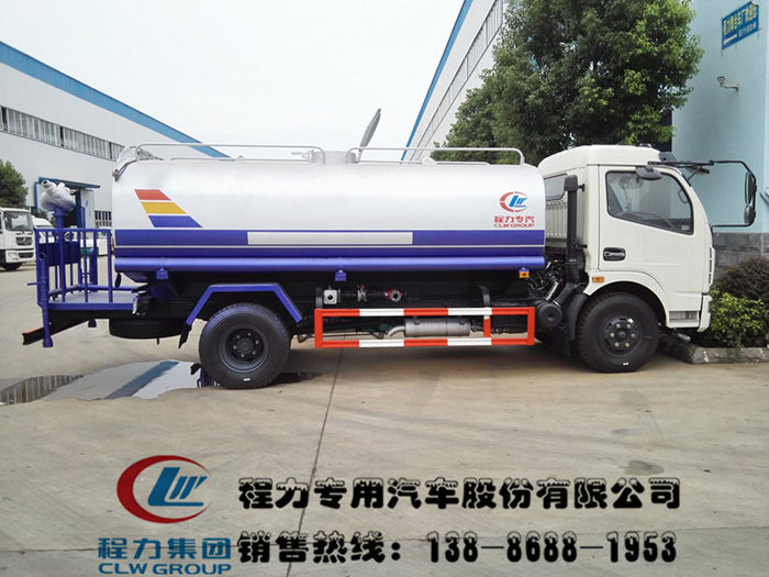 东风145,10吨洒水车:驾驶室一排半、可以前翻、发动机玉柴140马力发动机、900尼龙胎、罐体容积10.5立方、钢板厚度4毫米、洒水车功能配置:前冲后洒、侧喷、罐体后置工作平台、绿化洒水炮、射程30米。
