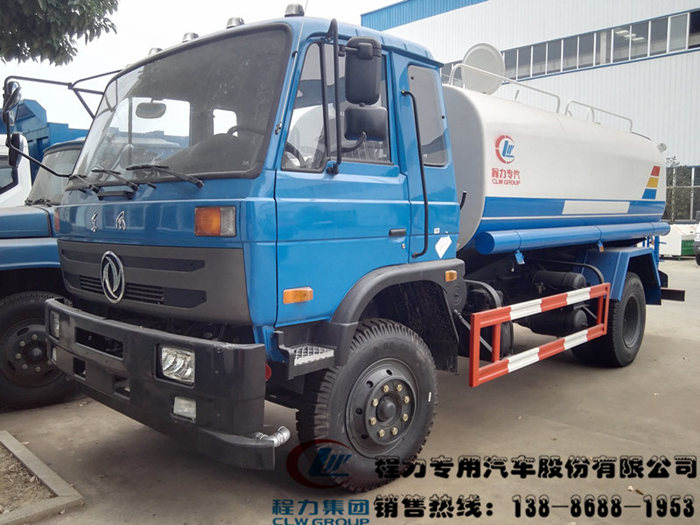 东风153,12吨洒水车:驾驶室一排半、可以前翻、发动机康明斯170-180马力发动机、900尼龙胎、罐体容积12.5立方、钢板厚度4毫米、洒水车功能配置:前冲后洒、侧喷、罐体后置工作平台、绿化洒水炮、射程30米。