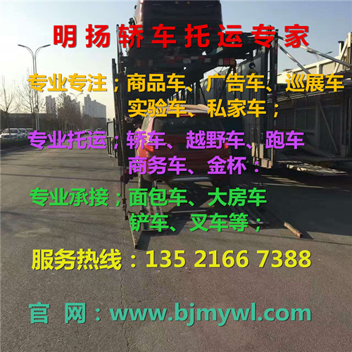 北京明扬物流【135 2166 7388 / 010-6120 6687】是专业从事轿车托运的物流公司、现掌控全国轿车托运网点及配送等业务、无论你的车在哪个城市我们都能帮您安全托运到位、只需您一个电话。全年无假日承接私家车托运、商品车托运、巡展车托运、二手车托运、广告车托运、电动车托运、4S点试驾车托运等、拖车送保险门到门服务、国内往返拖运、全程保险、让您无后顾之忧、拖车我们是认真的……