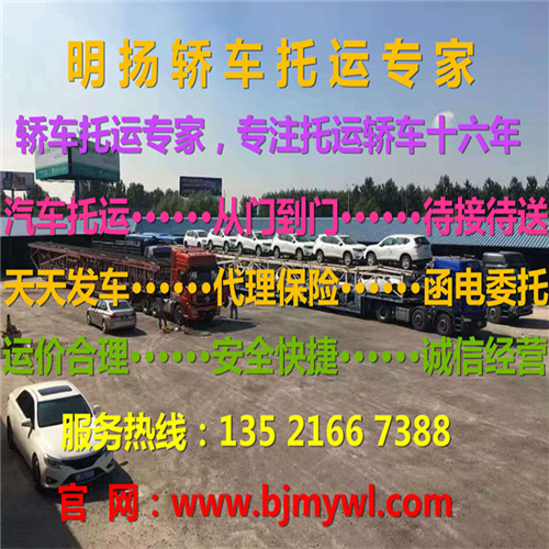 北京明扬物流【135 2166 7388 / 010-6120 6687】是专业从事轿车托运的物流公司、现掌控全国轿车托运网点及配送等业务、无论你的车在哪个城市我们都能帮您安全托运到位、只需您一个电话。全年无假日承接私家车托运、商品车托运、巡展车托运、二手车托运、广告车托运、电动车托运、4S点试驾车托运等、拖车送保险门到门服务、国内往返拖运、全程保险、让您无后顾之忧、拖车我们是认真的……