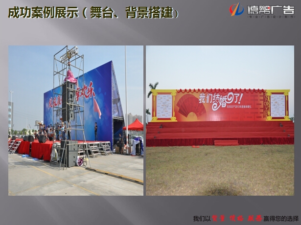 大型文艺晚会演出、新闻发布会、服装发布会运动会、户外SHOW等;主要提供演唱会,大型年会,新闻发布会,品派发布,商务会展,T台走秀,等等活动的物料,路演促销等等活动的演出器材,