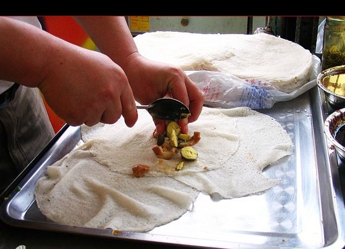 芙蓉蛋卷是正宗的成都特色小吃,外面包裹四张雪白的圆饼,里面包美味的卤蛋和经过精心炒制和调味的豆腐皮、素海螺、蔬菜等,再加上红油、蒜汁看着就让人流口水。诱人的名字再加上更诱人的味道,难怪买芙蓉蛋卷的小店前整天有人排队。