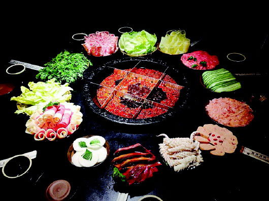 吃九宫格火锅的讲究地方:中间格火力旺,不适合久煮,适合放一些鸭肠、毛肚之类即烫即熟的菜品;旁边格火力稍弱,但是均匀,适合放鲜肉、牛蛙等需要煮熟才能吃的菜品;格子的脚上火力最小,比较适合炖煮时间长的菜品。