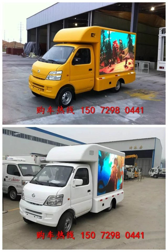 长安led广告车是小型led广告车。整车尺4650×1695×2600mm; 整车采用重庆长安底盘,长安53马力国四发动机,165的真空胎,轴距2500mm,带暖风,侧屏尺寸为2304*1408=3.2个平方,尾屏尺寸为1280*960=1.22个平方,屏幕规格:可采用P10/P8/P6。电脑,音响,功放等设备配备齐全。