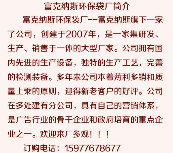 南宁富克纳斯环保产品有限公司的价格绝对优势:南宁富克纳斯环保产品有限公司是厂家直销,下面拥有多家生产厂;公司注重对高新产品的研发,并不断加大对技术改造和设备的投入,拥有做工成本价格优势;公司创建以来,秉承 “以人为本、质量取胜、消灭白色污染为已任”的企业经营准则,是中国环保事业的骨干企业和政府重点培育的大型企业之一。广西礼品袋制作厂,南宁定制环保袋,柳州袋子印刷