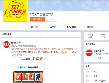 2、拍摄身边《我们是网红,也是创业者》的广告海报,在微博晒出广告照并#727广告拍卖节#,或在朋友圈晒照并截图私信易播网微信公众号,我们将抽出幸运朋友送出1000元现金奖励;