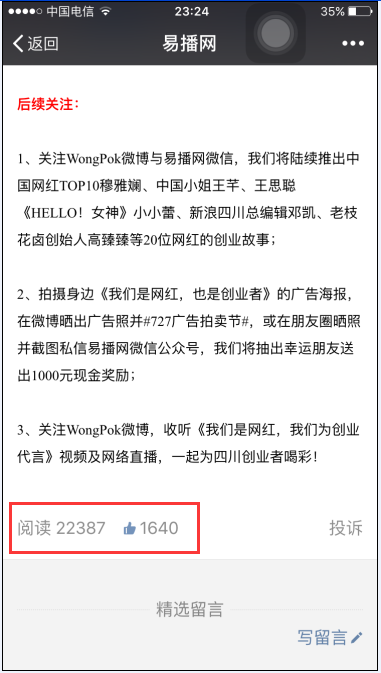 目前,727相关活动仍在继续,7月28日至8月3日设置有“返场捡漏专场”,所有流拍产品均可以起拍价协议购买,用户可登录易播网51ebo.com查看。7月底易播网联合中国网红TOP10穆雅斓,华盟传媒WongPok,中国小姐王芊,王思聪《HELLO!女神》小小蕾,新浪四川总编辑邓凯,老枝花卤创始人高臻臻等20位红人推出的创业背后故事也正在热播,敬请关注。