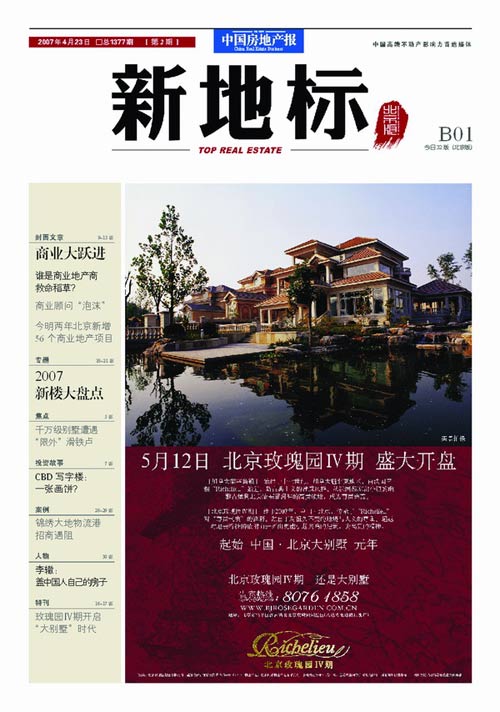 做最有用的地产资讯,弘扬高端地产、魅力地产、智性地产、健康地产新概念。分封面文章、独家、租售市场、排行榜、房市理财等四大板块。依托中国房地产报权威影响力和全国发行网络,立足北京,报道环渤海,将地产新概念延伸至全中国,为广大中外高端不动产投资置业者提供独家、权威、有效的深度资讯。