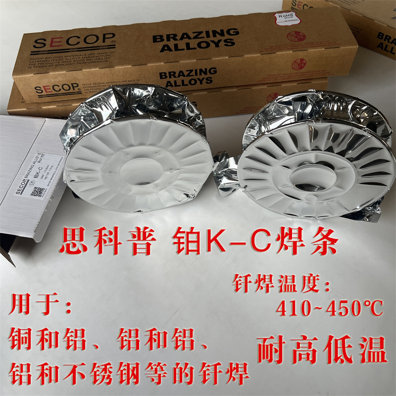SECOP新研制的铜铝异种金属钎焊用药芯钎料铂K-C。该钎料焊接温度420℃~490℃,操作方便,可使用火焰钎焊进行焊接,不需另外添加钎剂,焊接接头强度高,密封性好,能钎焊铝—铝、铜—铝、铝—不锈钢及铁合金。是制冷空调冰箱、电机、变压器等行业实现铝代铜的理想焊接材料,具有节约资源、能源、等许多优点,能给用户带来的经济效益和社会效益。