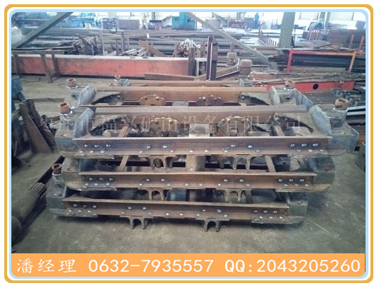 1吨矿车底盘由车架、碰头等组成,车架用于支撑和焊接车箱,并与轮对连接,碰头上布置有连接装置,实现车辆间的链接,缓冲碰头上装有橡胶冲件,能大大减少连接时的冲击力。