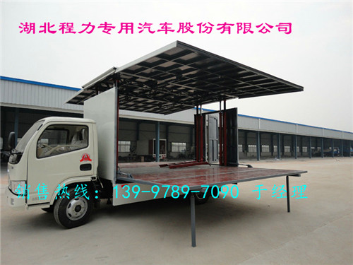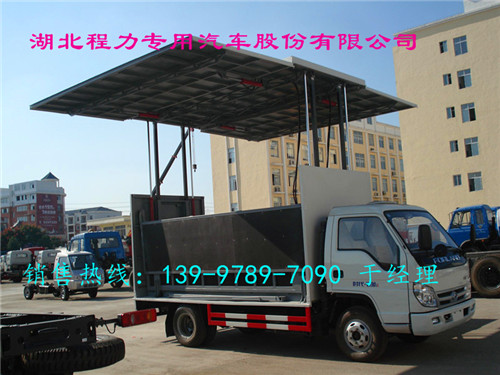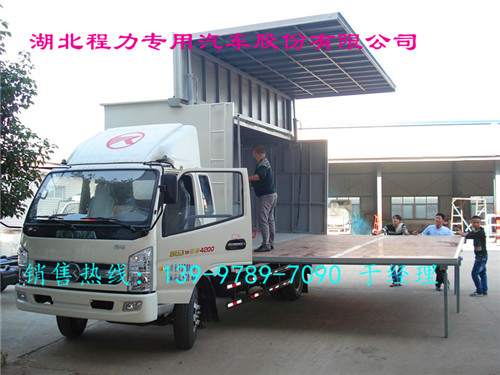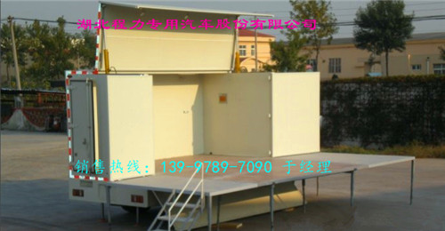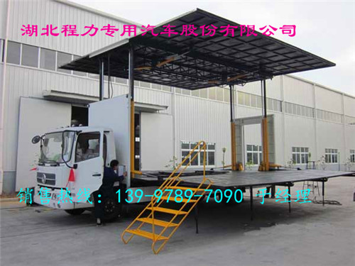 流动舞台车是一种方便流动演出的、并可展开成为舞台的特种汽车,它主要包括底盘部分和上装部分两大部分,上装部分由顶板侧板底板组成,而侧板和顶板分别由四个液压油缸控制展开即成舞台的台顶,底板展开四个液压油缸控制成舞台,省去传统搭台程序,省时省力操作简便安全可靠,功能齐全,外观美观。该车已获国家专利。