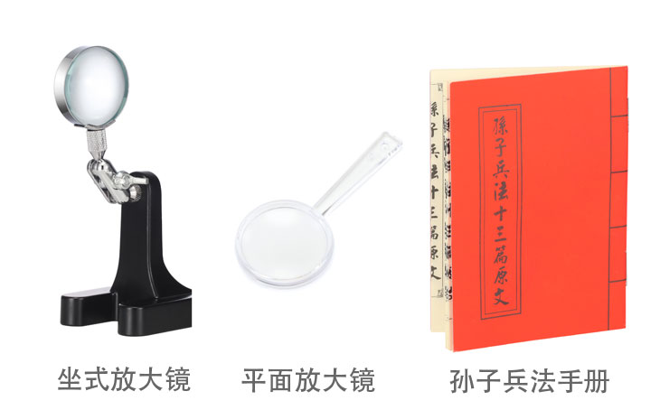 孙子兵法手册*1*册 紫砂壶*1*套 坐式放大镜*1*个 平面放大镜*1*个 收藏证书*1*张 合格证*1*张