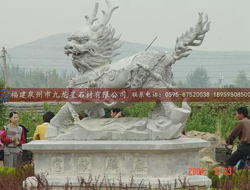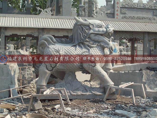 麒麟是中国古代神话传说中的神兽,据说能活两千年。性情温和,不伤人畜,不践踏花草,故称为仁兽。麒麟的首似龙,形如马,状比鹿,尾若牛尾,背上有五彩毛纹,腹部有黄色毛。麒有独角,麟无角,口能吐火,声音如雷。中国古代用麒麟象征祥瑞。而石麒麟是对神兽的实体化的表现。