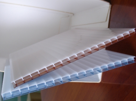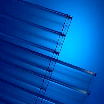 ● 隔热性: PC阳光板属线膨胀系数较小的合成树脂之一。板材的不同方向线膨胀系数略有不同,平均在0.065mm/m.℃。PC阳光板的热传导率与一般合成树脂差异很大,是玻璃发1/4,铁的1/300,铝的1/1000,铜的1/12000,属保温性良好的材料。多层中空阳光板隔热效果尤佳。