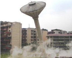 2、高耸水塔定向整体拆除方法:一般先在水塔底部先量好中心点,然后测算好开洞的宽度,接着就沿画好的线开洞,边开洞边用厚木板或木棍顶住,这样可以有效预防水塔随时有倒下的危险,待洞开到足够位置的时候,就用火把把木板(木棍)点燃,这样等木棍燃烧到一定程度后水塔就会自动按定好的方向倾倒了。尤其需要提醒的是在拆除施工时水塔现场及周围必须严令禁止一切无关人员进出和滞留,预防不安全因数的发生!绥芬河水塔爆破公司《水塔爆破拆除-水塔定向爆破》