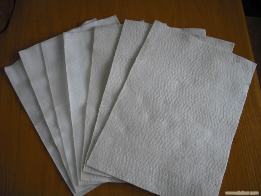 非织造土工布有短纤针刺土工布和纺粘法长丝土工布。短纤针刺土工布是以涤纶、丙纶或锦纶短纤为原料,通过和毛、流理、铺网、针刺、复针刺加工而成。其特点是密度高、结构蓬松、防腐、耐老化、耐酸碱、吸水性和透水性能好、抗拉强度高、抗形变能力大。适用于防治路面翻浆、护坡、水渠保护层等工程中,在国内应用较广泛。如辽河油田的海滩,土质多呈高含水、高压缩性、低承载力的软塑和流塑状口在春融期开始铺路时,由于土壤水份重新分布变化,导致路面严重翻浆。针对这种状况,辽河油田设计选用了国产LHw一4叨涤纶针刺无纺土工布来防治春融期冻土填方路基的路面翻浆。具体做法是在矿渣路面下设单层LHw一400土工布作为隔离层。试验结果表明,这种土工布具有显著的隔离作用,能有效地防治路面翻浆冒泥,并具有补强作用和应力扩散作用,大大提高了湿软路基的稳定性。又如大广坝枢纽工程拦河大坝全长5842米,其中左岸土坝2792米,右岸土坝2339米,在土坝上游护坡采用了针刺无纺布和抱石相结合的方法护坡。经过两年的护坡施工后表明,该方法具有抗风浪冲刷,减小风浪爬高及适应变形能力强等优点。再如投资8亿元的山东引黄济青工程中,选用了山东昌邑无纺布厂生产的短纤针刺无纺土工布作渠面保护层,工程设计用布量为90多万平方米、施工方法是在渠面上铺放一层塑料膜,上方再铺土工布,然后排好混凝土板防止渠中水同地下渗漏,而长丝土工布主要起保护作用,以防止塑料布被混凝土板破坏:此外,短纤针刺土工布还应用于安沟河水坠坝中作为排水设施,应用于海堤软基处理等,都收到了较好的技术效果和经济效果。
