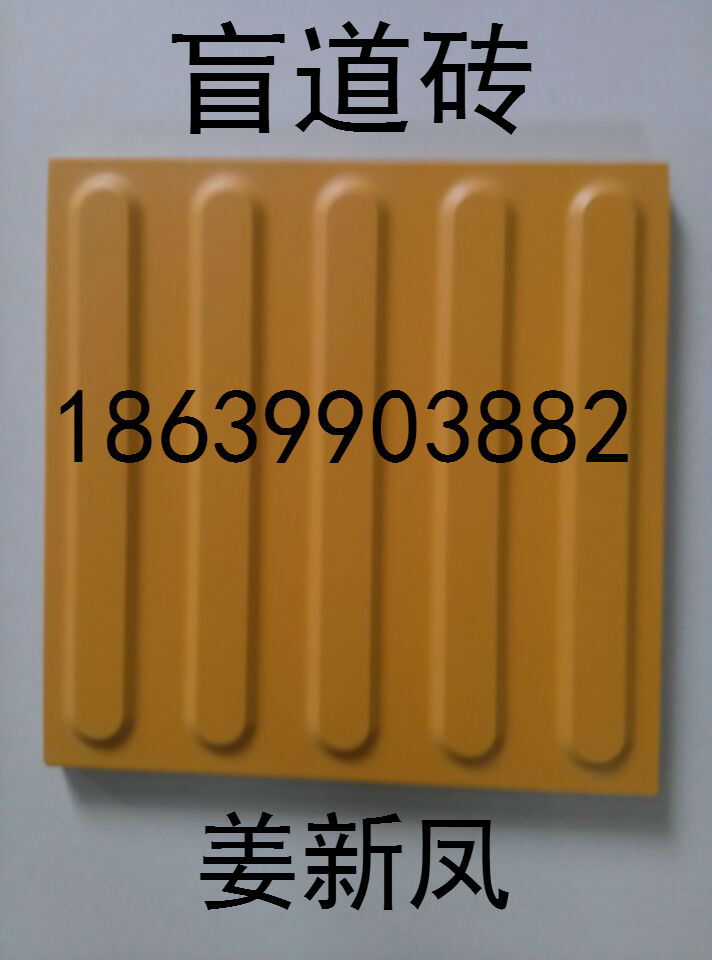 盲道砖是为盲人安全提供的行路方便道路设施。盲道砖由三类砖铺就,一类是条形方向引路砖,引导盲人放心前行,称为行进盲道砖,或盲道方向引路砖;一类是带有圆点的提示砖,提示盲人前面有障碍,该转弯了,称为提示盲道砖,或盲道方位引路砖;最后一类就是盲道危险警告引路砖,圆点较大的,就是警视不要超越,前面危险。我公司生产的盲道砖规格有300*300*20 300*300*25 等,可来图定制。