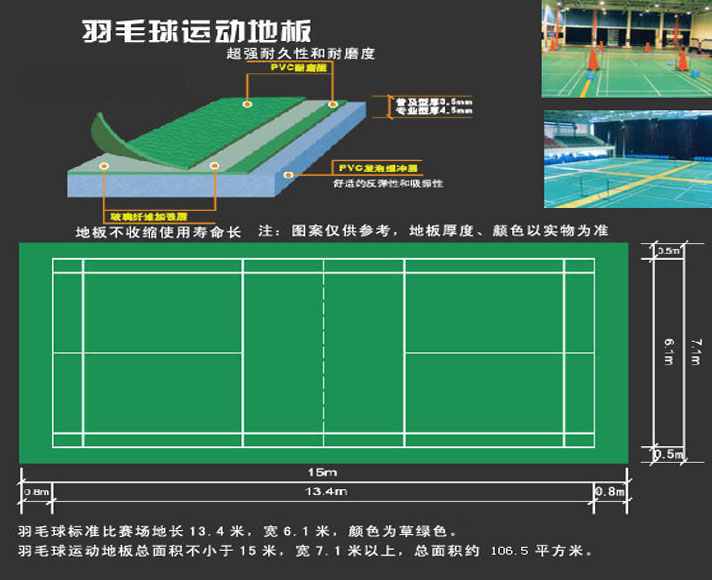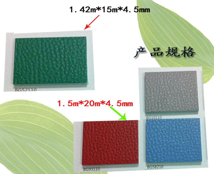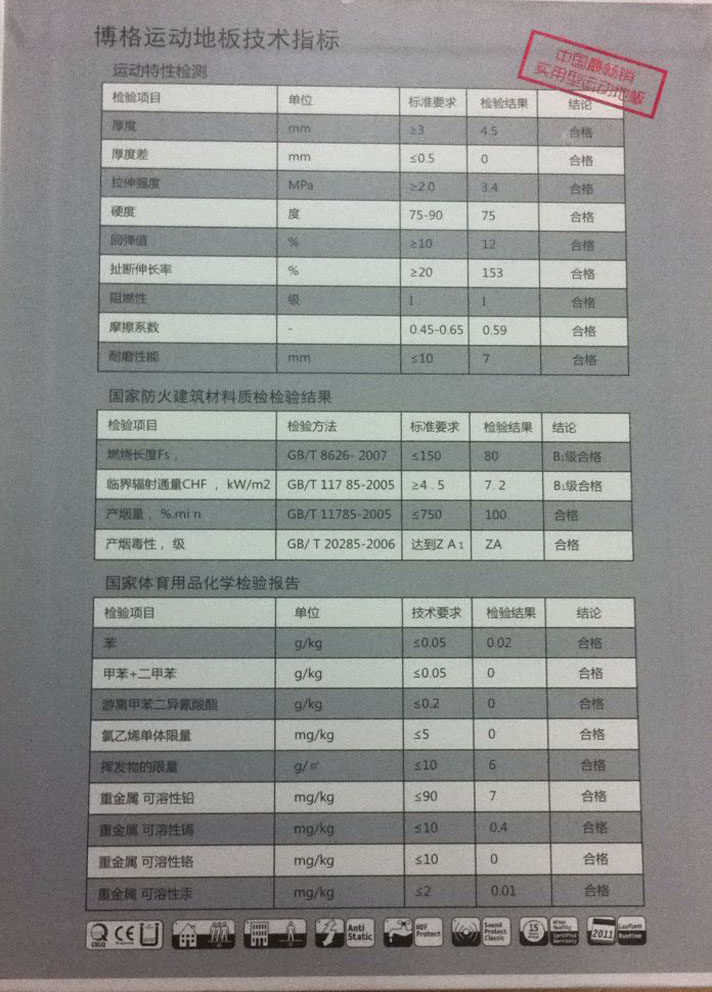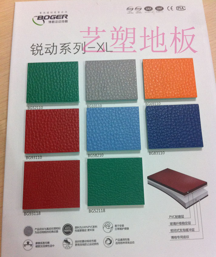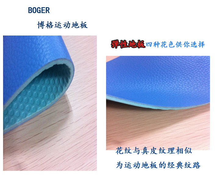 三特殊的表面结构,增强了摩擦力,创造了更加舒适和安全的运动地面环境。 四封闭式PVC地板发泡缓冲层材料和气垫式结构,提供绝对的安全性·回弹性和标准的吸振性。