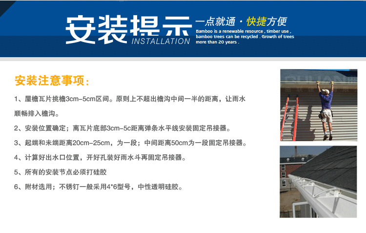 富阳幕思防水材料有限公司坐落于杭州市富阳。富阳幕思防水材料有限公司是一家规模较大  沥青瓦,油毡瓦,彩石金属瓦,PVC落水管  排水系统  等产品的生产和管理严格按照ISO9001,管理体系执行。我公司是一家专业研发,生产制造彩石金属瓦,PVC5.2英寸,7英寸成品檐槽(天沟),雨落水管及铝合金标准型5英寸,6英寸,7英寸等,不同型号的檐槽(天沟)雨落水管产品,供全国好国外市场需求。出厂产品经过严格的质量检测,其此项技术指标均达到QB/T2480-2000行业标准。产品质量保质年限三十年以上。