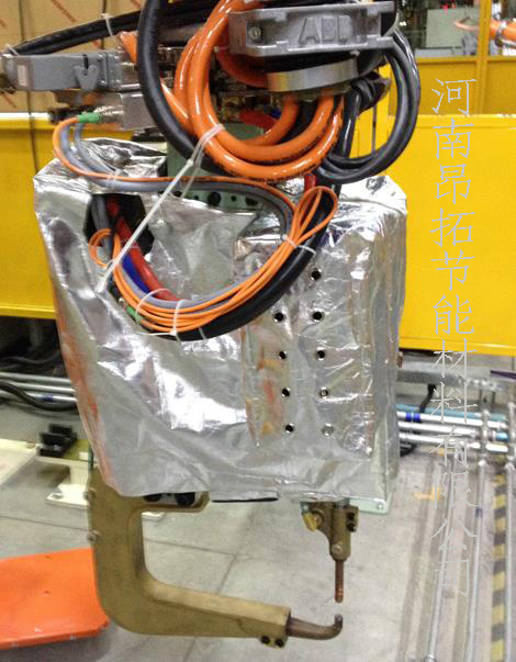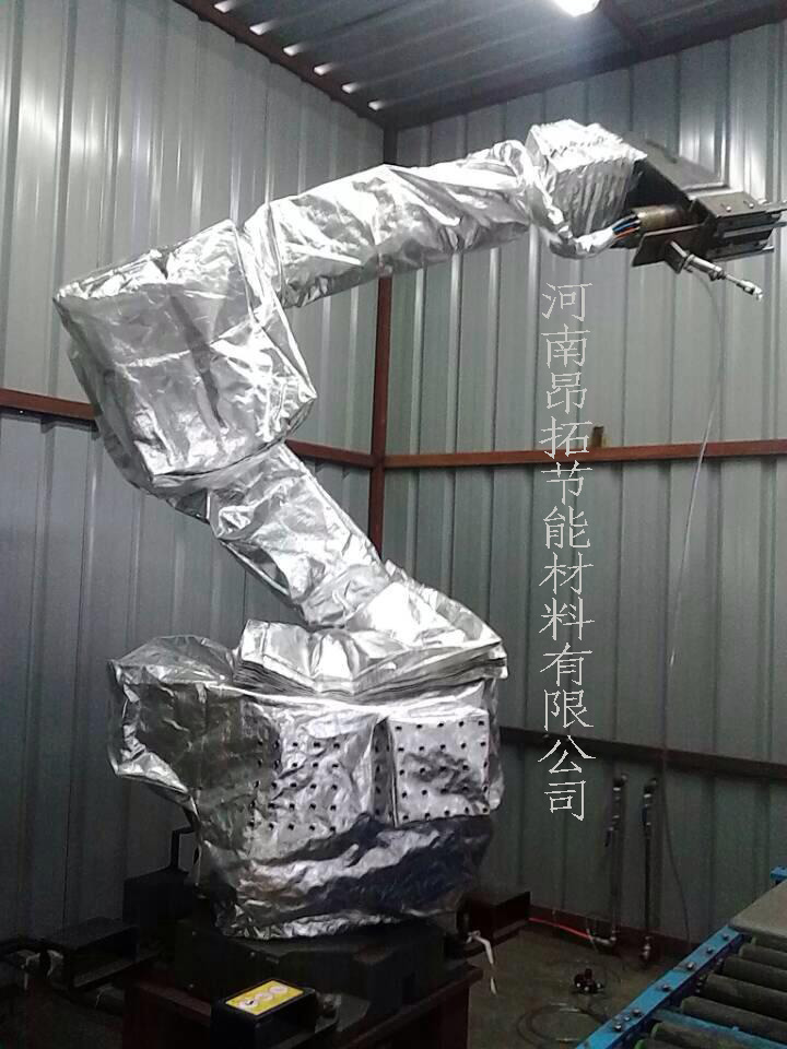 机器人手臂在工作中最怕高温火花和高温焊渣的喷溅,机器人手臂的数据线、水管等被焊渣附着后极易断裂、破损,经常需要更换。从而导致其堵塞、老化、破损,导致设备故障从而影响生产。使焊头逐渐老化,甚至烧坏供电线路,某些工位,焊枪导轨极易被焊渣附着、堵塞,堵塞后无法清理,必须更换导轨,造成了每年高昂的设备维护费用。所以机器人手臂防护罩需要像人类的衣服一样柔软紧密的包裹在焊接机器人手臂上,避免火花随缝隙钻进机械手防护罩内。