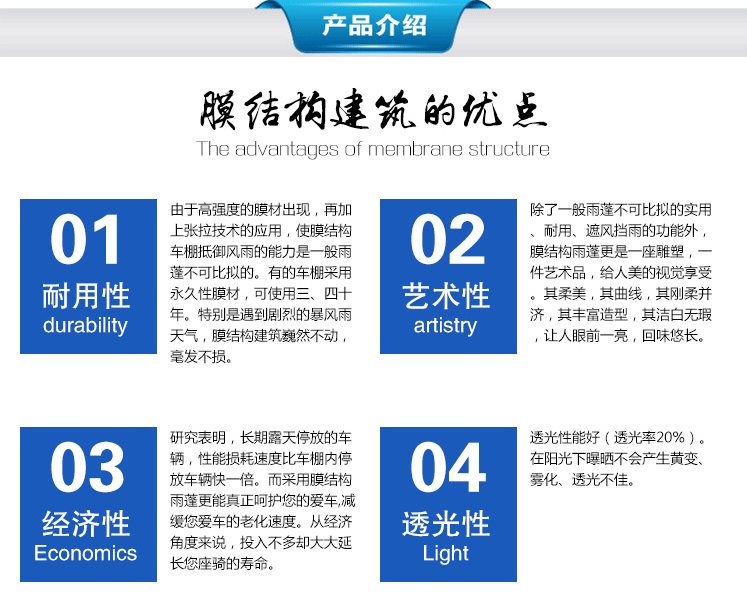 随着膜结构车棚大量出现在我们生活当中,膜结构车棚也被人们所关注,而膜结构车棚不仅具有强度高、耐久性好、防火难燃、自洁性好,不受紫外线影响,更有高寿命之说,可以长达15-30年,以下就让景祥膜结构公司的技术小编来为您介绍有关膜结构车棚的一些特点及会存在的问题。