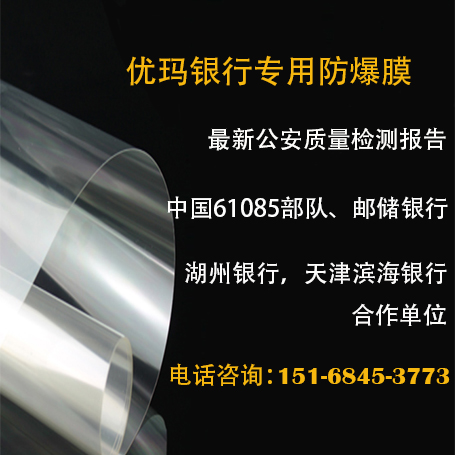 银行12MIL防爆膜,银行11MIL防爆膜,银行0.275MM防爆膜首选优玛玻璃贴膜,湖州银行,天津滨海银行,邮储银行,农商银行等多家银行案例验证,最新公安质量检测报告,联系方式如下: