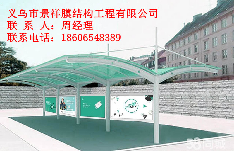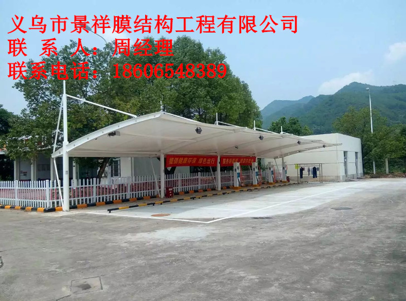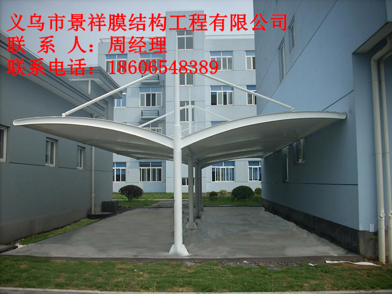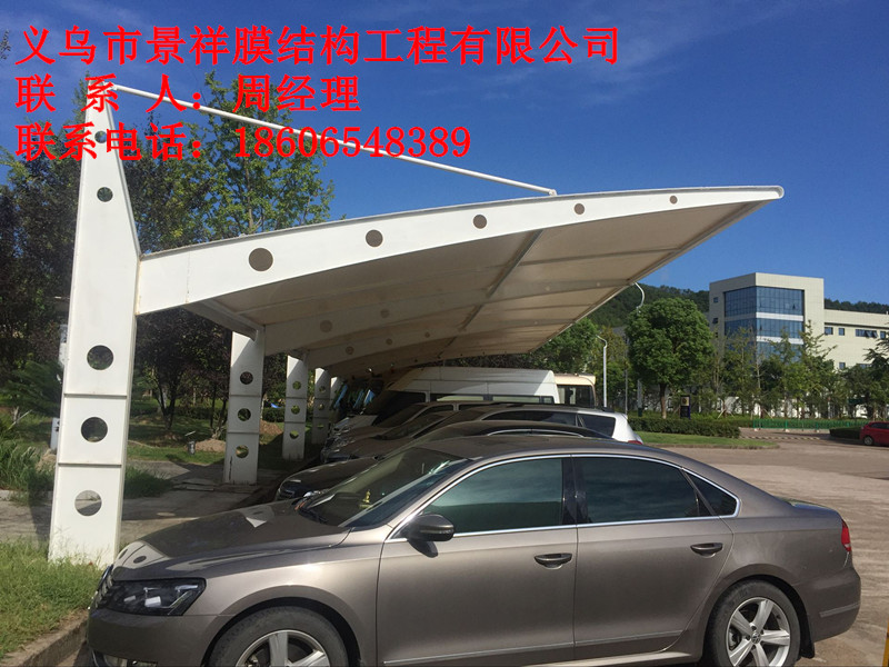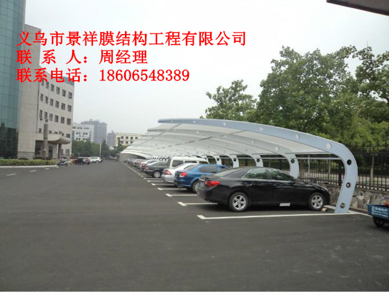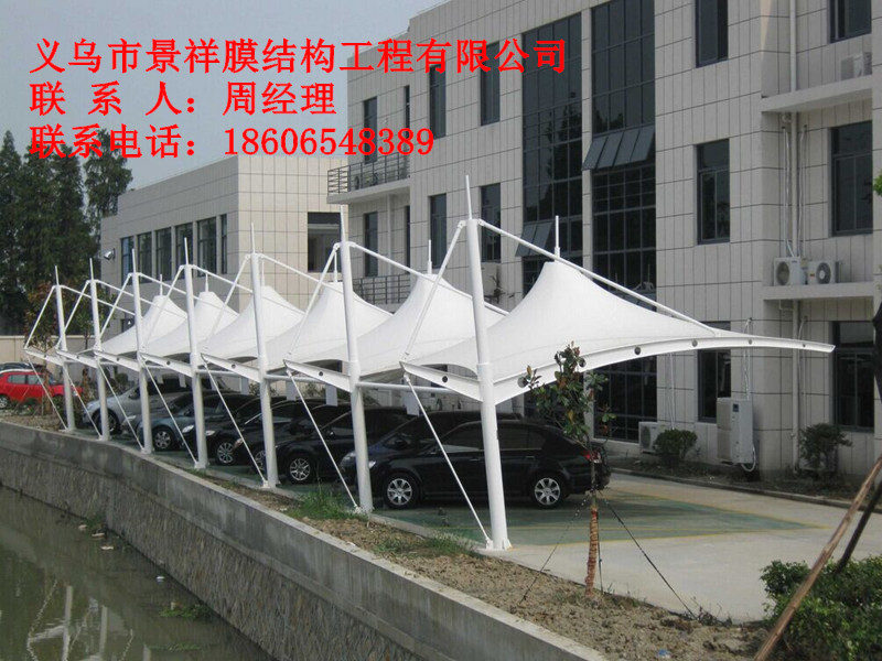 膜结构车棚的 篷布材质是膜结构,而膜材的最大特点是强度高、耐久性好、防火难燃、自洁性好,不受紫外线影响,使用寿命长,一般10年以上。具有高透光率,透光率为13%,对热能反射率73%,热吸收量很少。正是因为这种划时代的膜材料的发明,使膜结构车棚成为现代化的永久建筑。浙江景祥膜结构公司长期供应:pvc/pvdf1100克膜材;960克膜材; 。使用于大型体育馆,网球场各种公路收费站加油站休闲公寓公司停车膜棚等等,微信/电话订购: 周先生 欢迎来电咨询洽谈